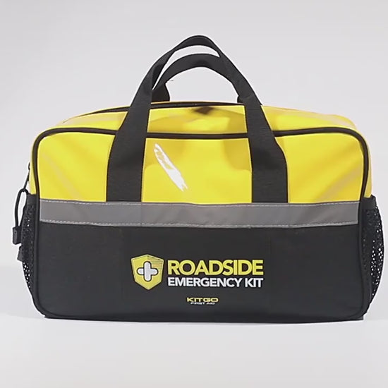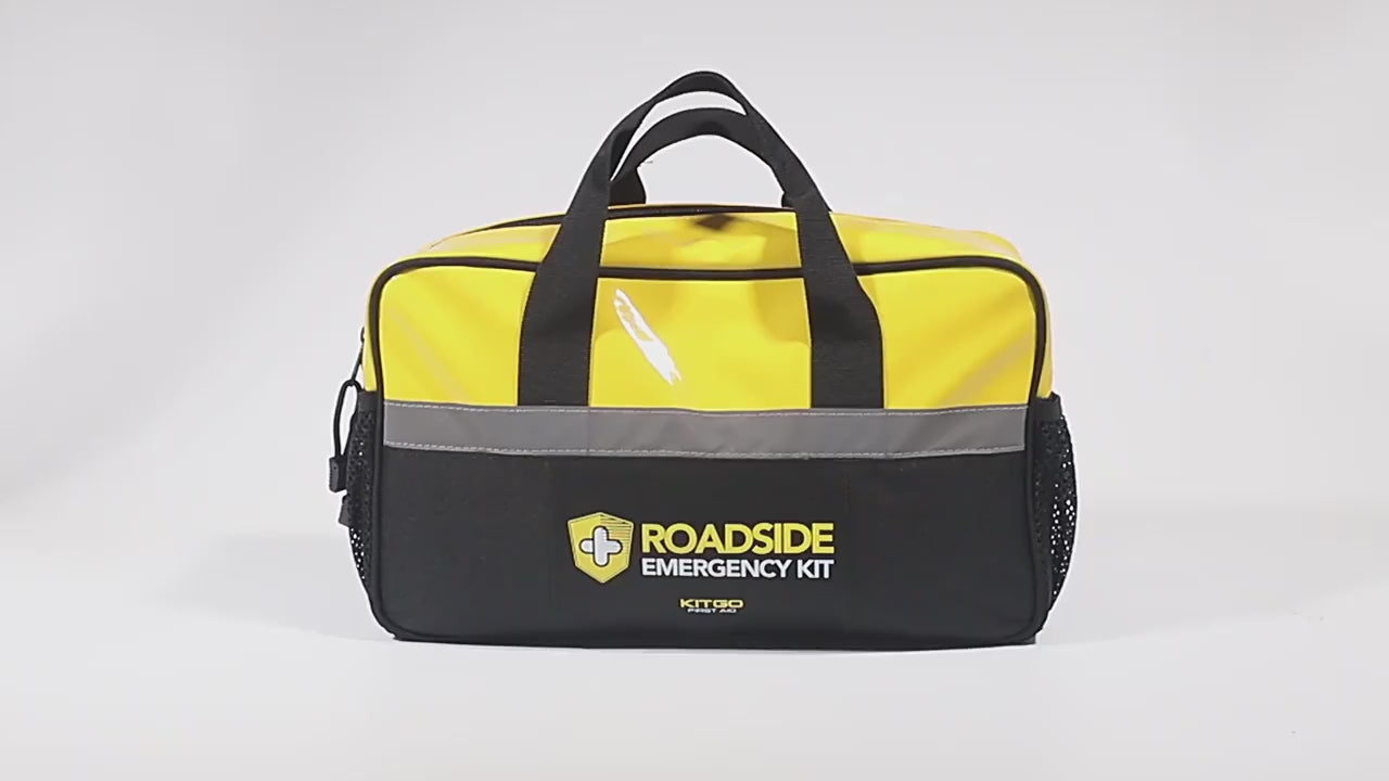 Trusa include toate elementele esențiale pentru urgențe auto, cum ar fi bandaje, instrumente de reparare și alte produse de prim ajutor.